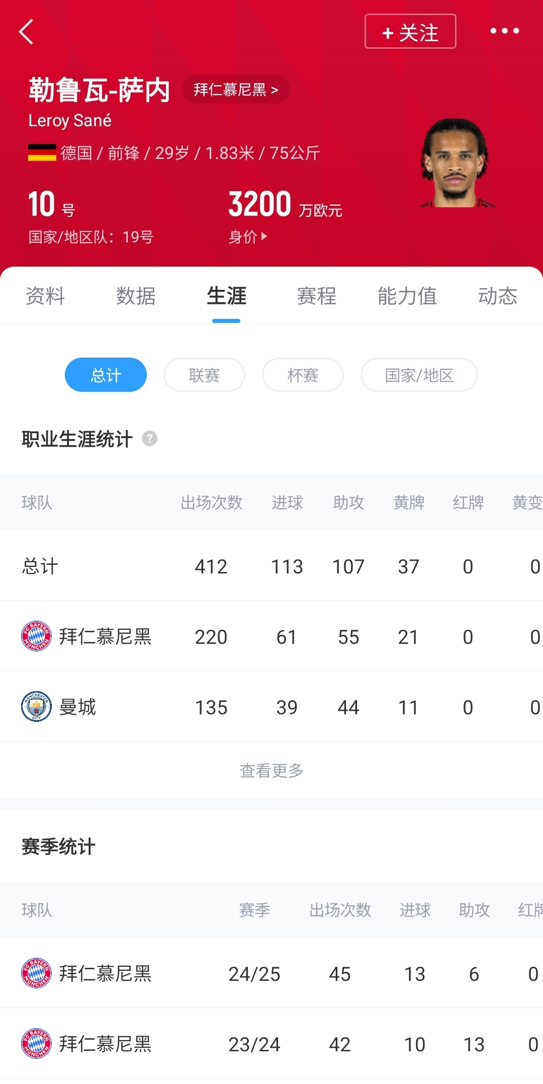 萨内,现年29岁,德国边锋,2020年夏窗拜仁花费4900万欧转会费从曼城引进球员,目前萨内共为拜仁出战220场比赛,贡献61球55助,他与拜仁的合同将在本月到期,目前德转身价3200万欧。